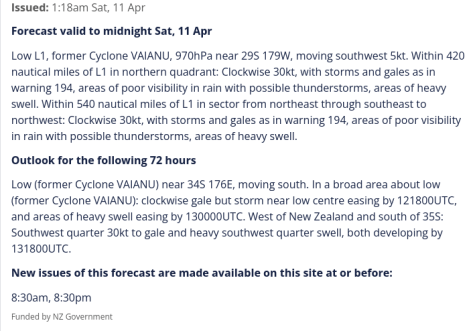 Below, the indication on Saturday 11th from Metservice about the 'former Cyclone'